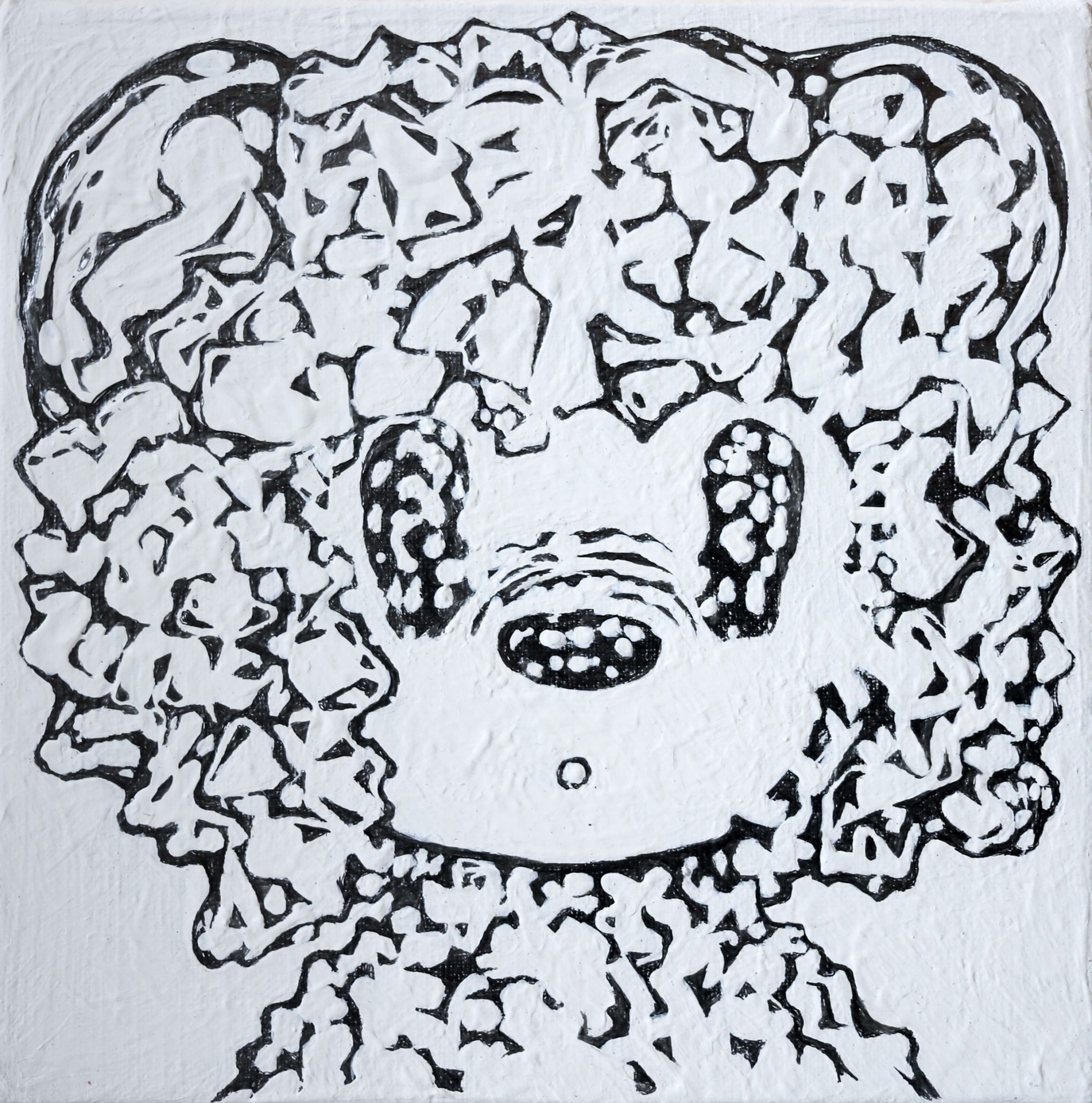 柔らかそうで堅そう重そうで軽そうな不思議な質感の空間を漫画的キャラで描いています
